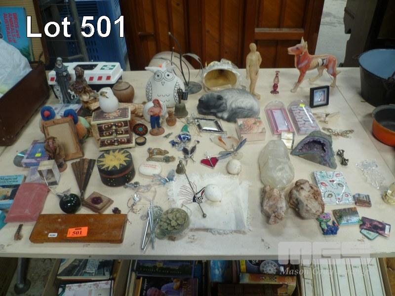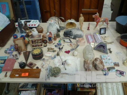 ASSORTED ORNAMENTS & COLLECTABLES, TAROT CARDS, LARGE CRYSTAL, ETC, 1 x TABLE