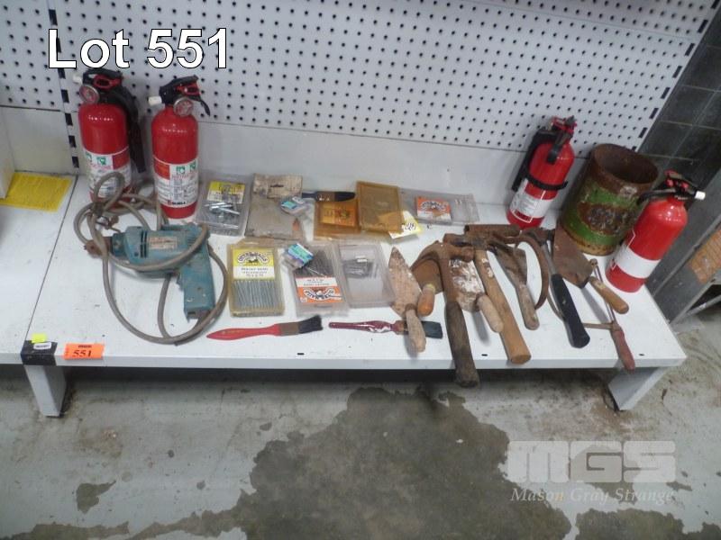 4 x DRY CHEMICAL FIRE EXTINGUISHERS & ASSORTED HAND TOOLS & FITTINGS