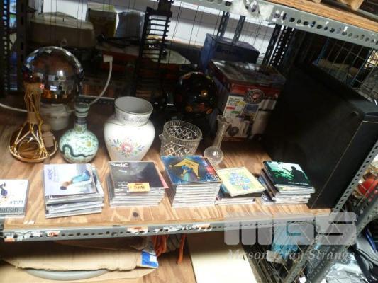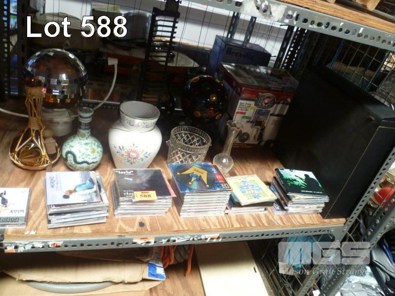 ASSORTED CD'S, DISCO LIGHTS, MAGIC BULLET, VASES, ETC