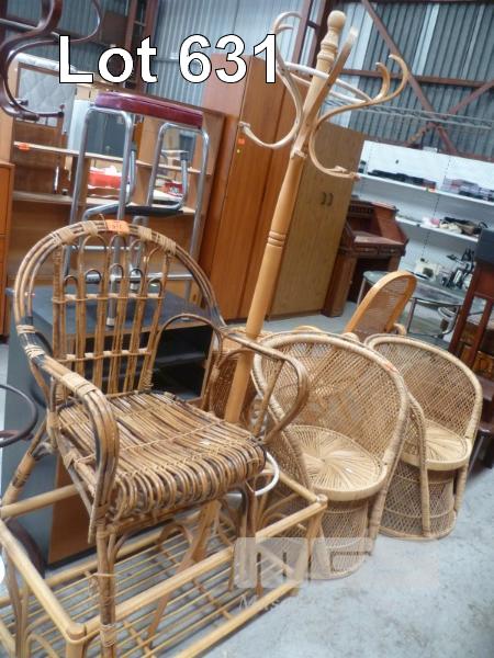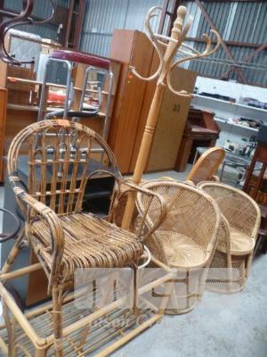 CANE ARM CHAIR, CANE COFFEE TABLE, (MISSING GLASS TOP) & BENTWOOD HAT/COAT STAND