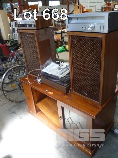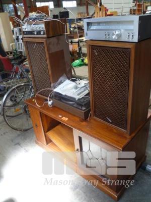 PINE LOWLINE ENTERTAINMENT UNIT, PAIR HANIMEX FLOOR SPEAKERS, PIONEER TURNTABLE, PL-12, TEAC AM/FM TUNER & HANIMEX AMPLIFIER