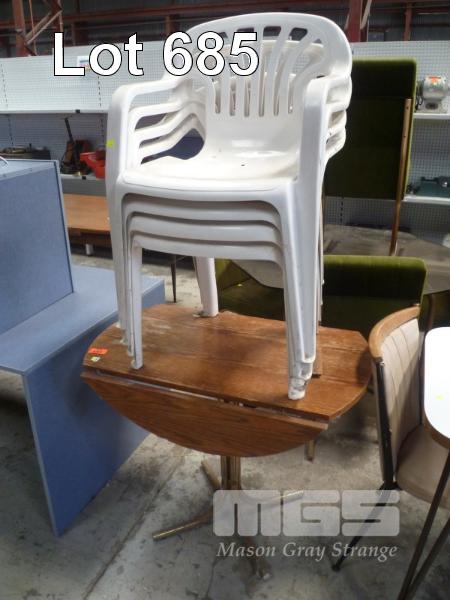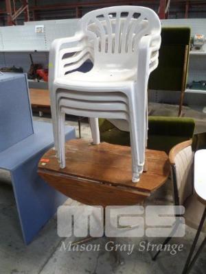 DROP SIDE TABLE, METAL BASE, TIMBER & 4 x STACKABLE PLASTIC OUTDOOR CHAIRS