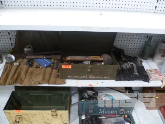 AMMUNITION TIN, SPANNERS, HAND TOOLS, ETC