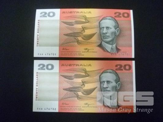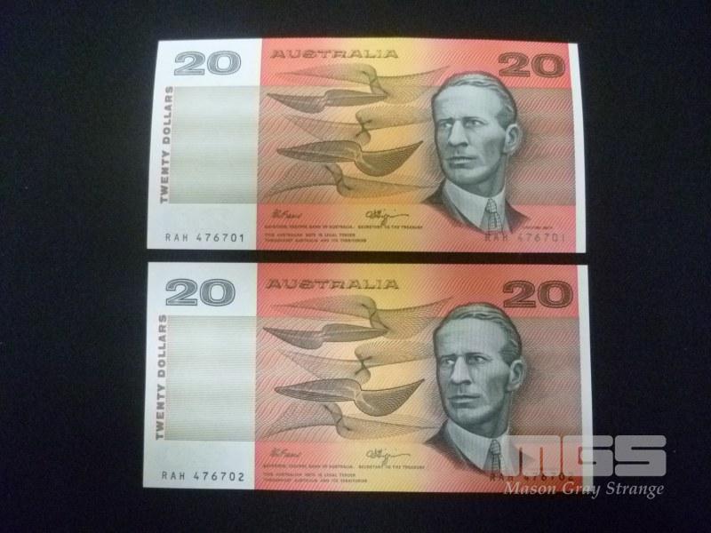 1989 2 x $20.00 FRAZER HIGGINS CONSECUTIVE APPEARS HIGH GRADE