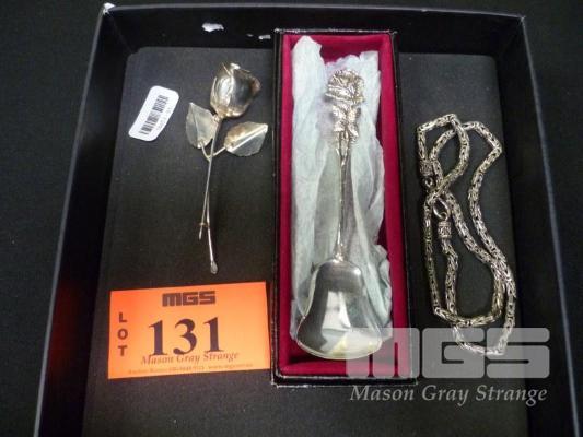 SILVER NECKLACE, ROSE BROOCH, MARKED 925 & SOLVER SPOON, MARKED 835