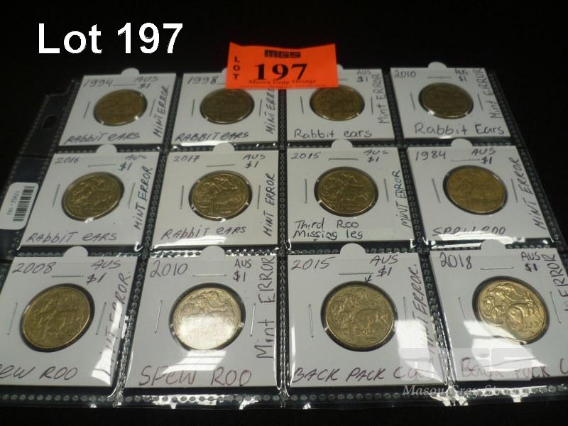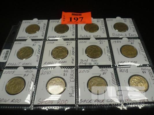 12 X AUSTRALIA $1 ERROR COINS, INC; RABBIT EARS, THIRD ROO MISSING LEG, SPEW ROO, BACK PACK CUD