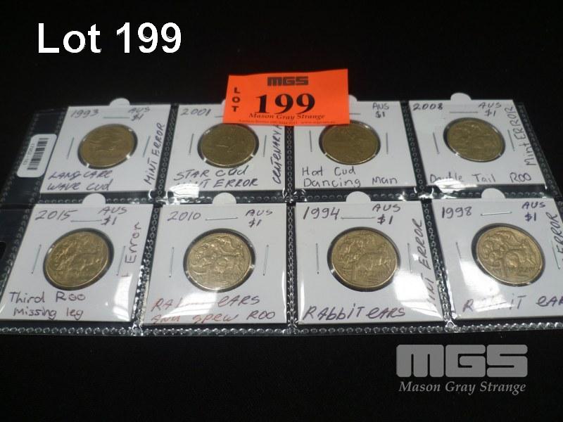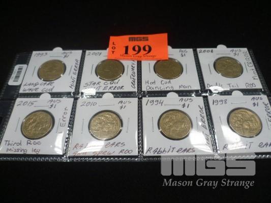 8 X AUSTRALIA $1 ERROR COINS, INC; RABBIT EARS, THIRD ROO MISSING LEG, DOUBLE TAIL, STAR CUD MINT ERROR, ETC