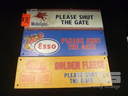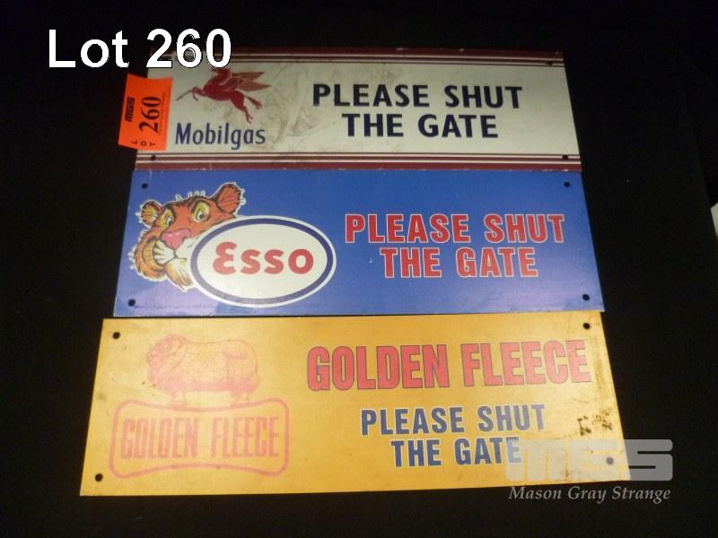 3 x SHUT THE GATE TIN SIGNS, ESSO, GOLDEN FLEECE & MOBIL