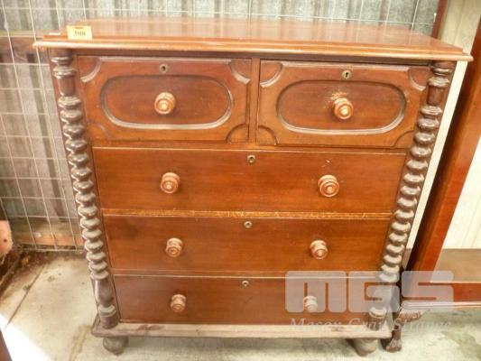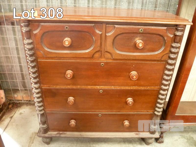 MAHOGANY CHEST OF 5 DRAWERS, (SPLIT ON TOP PANEL)