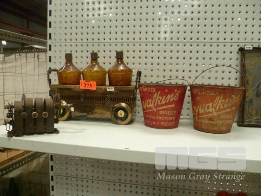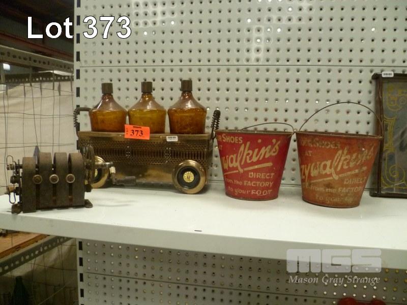 2 x VINTAGE EZYWORKS METAL BUCKETS, DRINK DECANTERS & MANUAL TELEPHONE GENERATOR