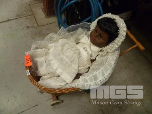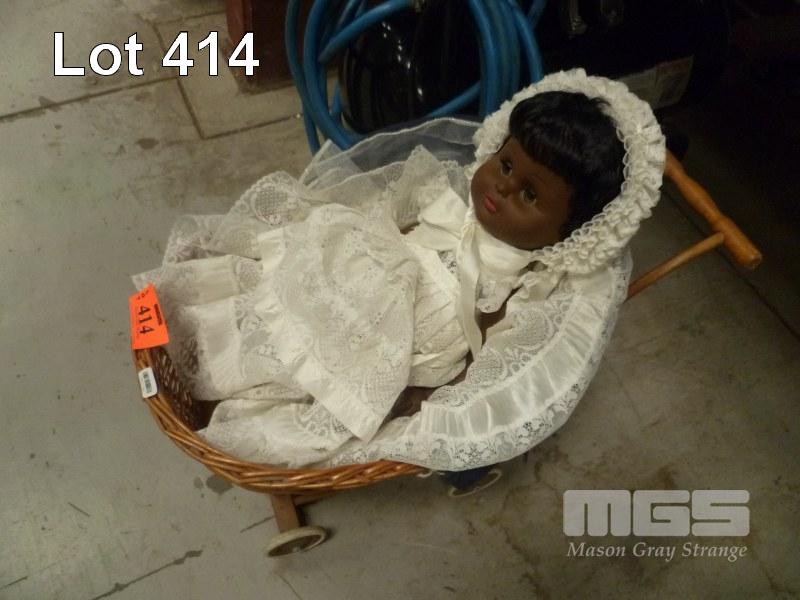 OLD CANE DOLL PRAM & COLLECTABLE BLACK DOLL
