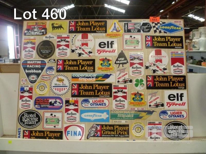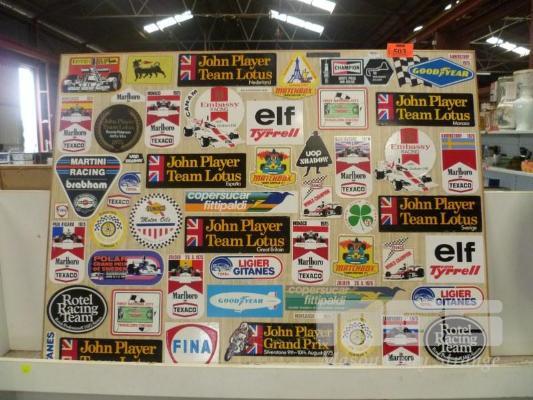BOARD SIGN FULL OF VINTAGE RACING STICKERS, 95 x 75cm
