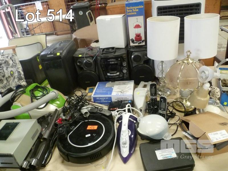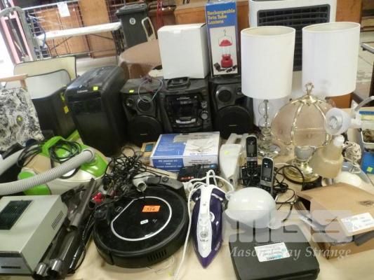 PANASONIC CD STEREO SYSTEM, FELLOWES PAPER SHREDDER, TARGET EVAPORATIVE COOLER, TABLE LAMPS, ETC, 1 x TABLE