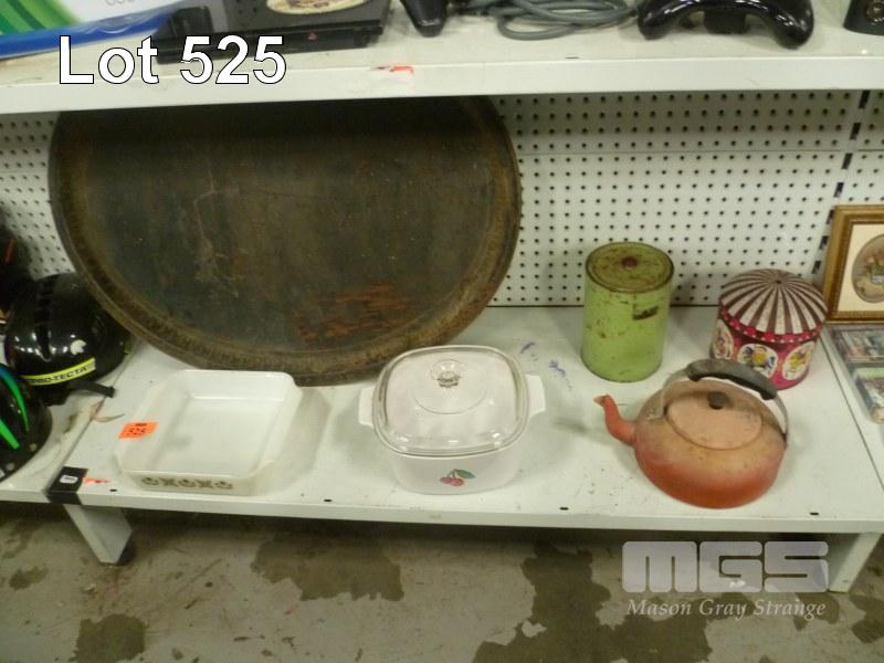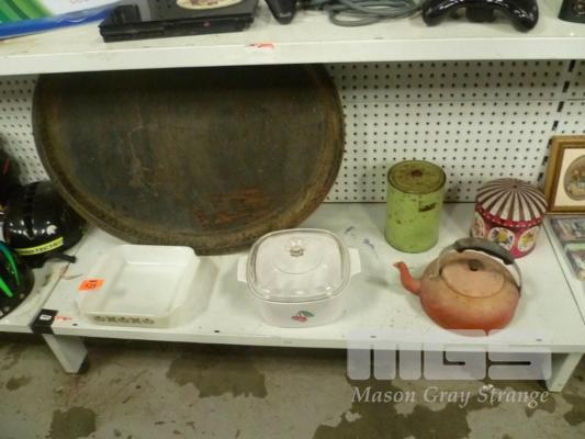 VERY LARGE CARVING TRAY & VERY OLD VINTAGE TINS, KETTLE & PYREX WARE