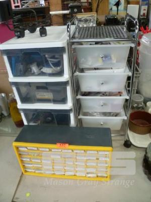 2 x MOBILE DRAWER UNITS & SMALL PARTS DRAWERS & CONTENTS SEWING & CRAFT SUPPLIES