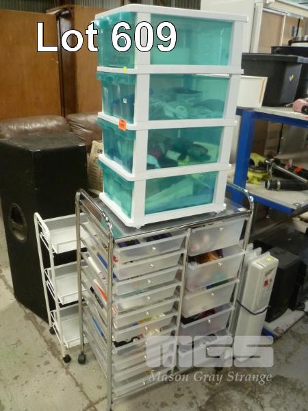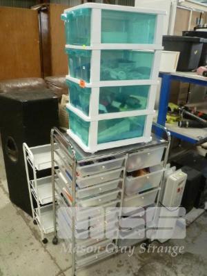 2 x MOBILE DRAWER UNITS WITH CRAFT SUPPLIES & COLUMN HEATER