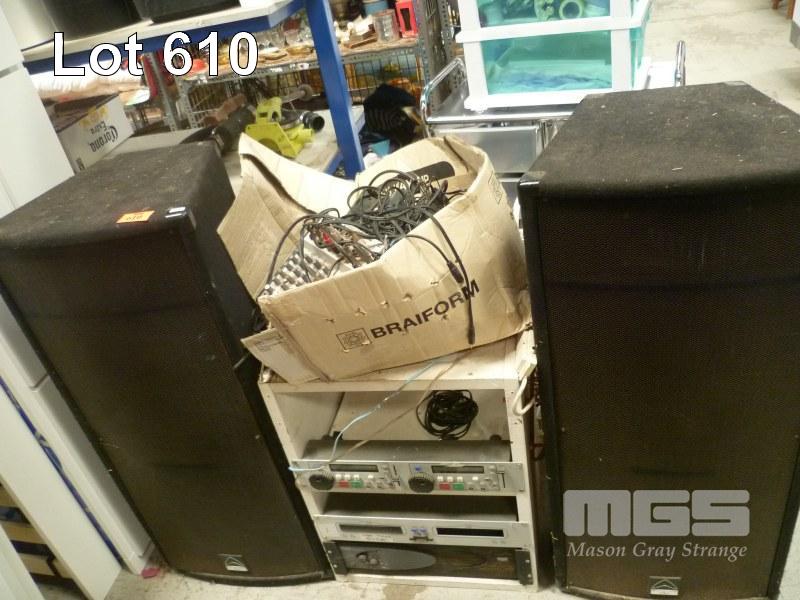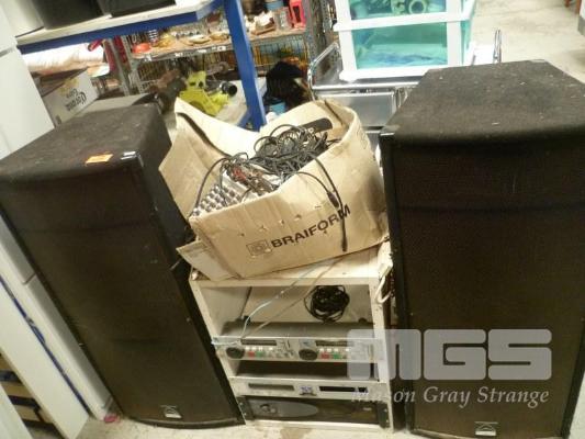 PA SYSTEM COMPRISING:- BEHRINGER 4 CHANNEL MIXER MIPRO MICROPHONE RECEIVER USA-900 POWER AMPLIFIER TWIN CD PLAYER STEREO COMPRESSOR PAIR WHARFEDALE PRO SPEAKERS