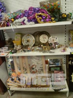 CHRISTMAS ORNAMENTS, MOBILES, FRAMED PRINTS, ETC, 3 x SHELVES