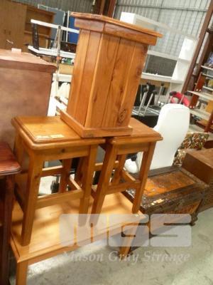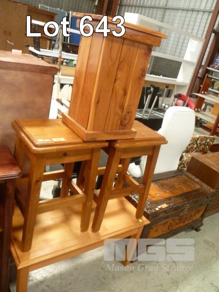 TIMBER COFFEE TABLE, PAIR STOOLS & PEDESTAL