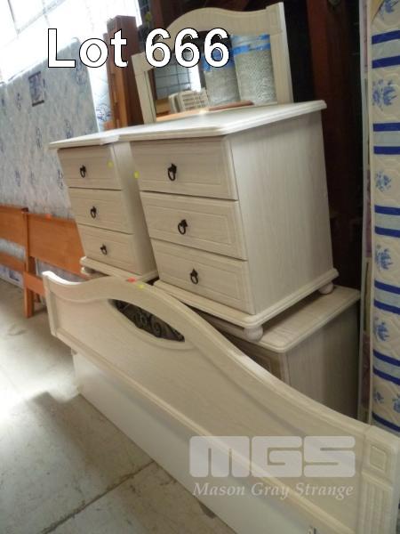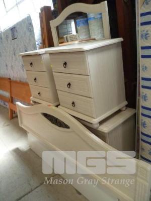 BLONDEWOOD LAMINATE BEDROOM SUITE COMPRISING 6 DRAWER MIRROR BACKED DRESSER, 2 x 3 DRAWER BEDSIDE CABINET & BEDHEAD