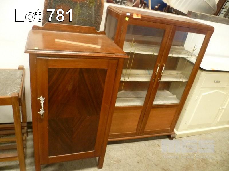 TIMBER ART DECO DISPLAY CABINET, TIMBER SHELVES, ETCHED GLASS DOORS & SINGLE DOOR CABINET