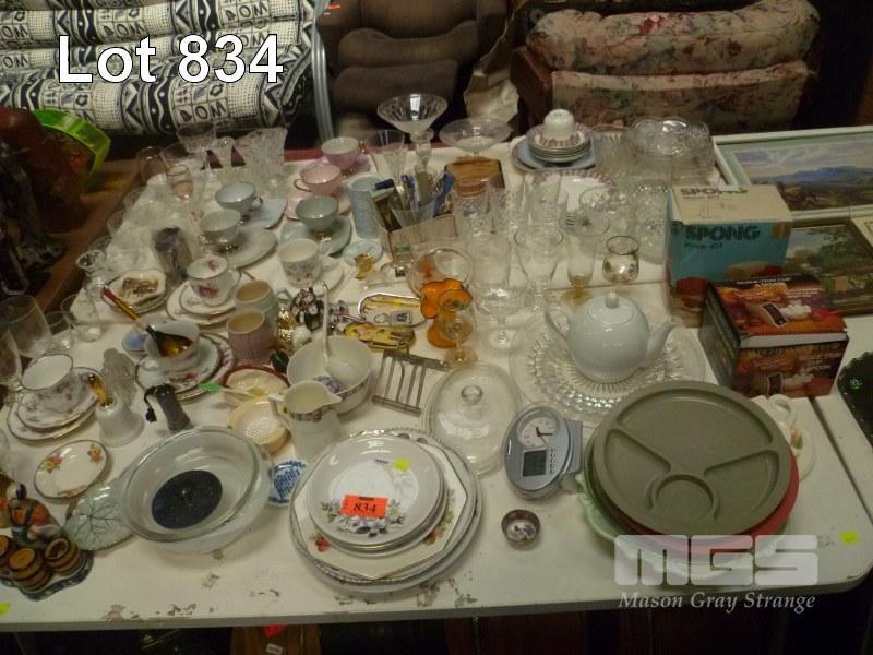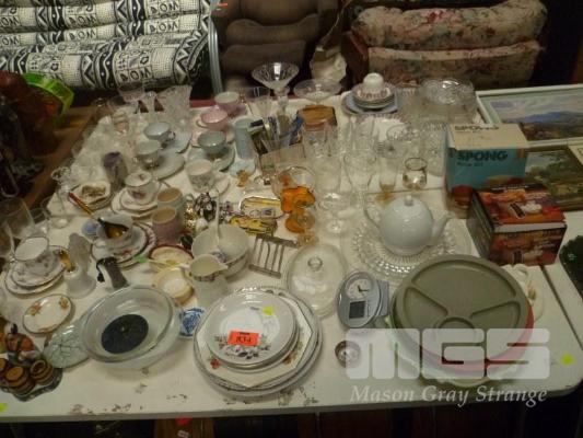 ASSORTED GLASSWARE, TEA TRIOS, PLATES, ETC, 1 x TABLE