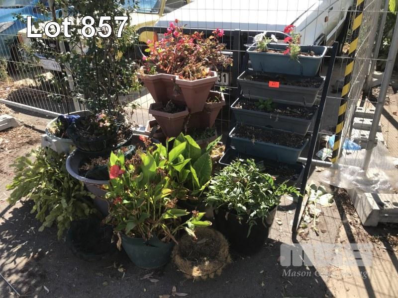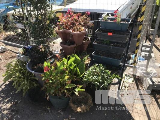 RAISED GARDEN STANDS, CREEPING PLANT ON ARCH, HANGING BASKETS, ETC