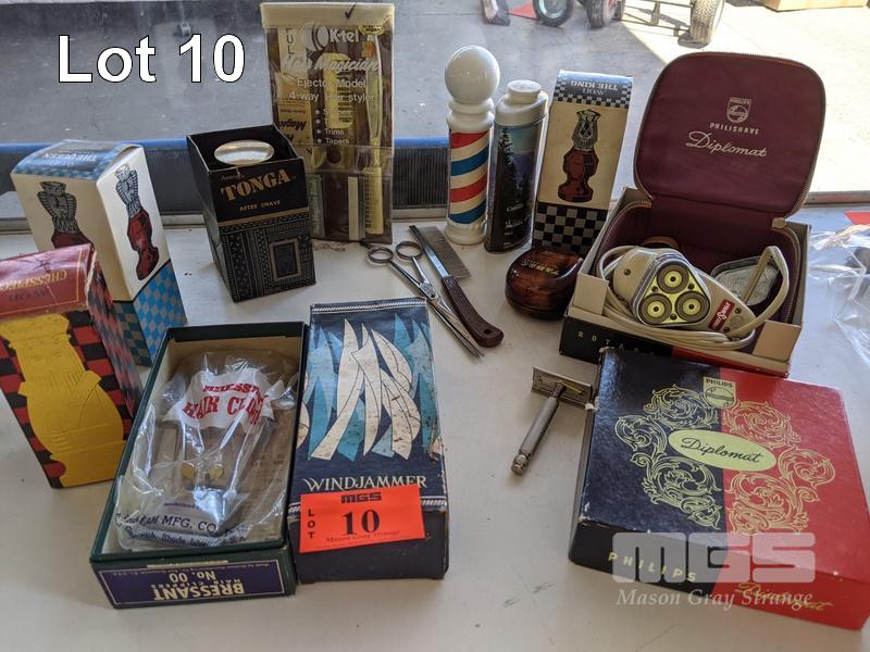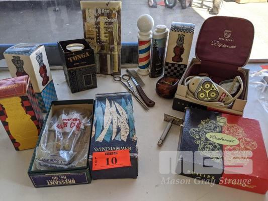 ASSORTED MANSCAPING SUPPLIES, AFTER SHAVES INC AVON & AMWAY, HAIR CLIPPERS, ORIGINAL PHILIPS PHILISHAVE DIPLOMAT SHAVER, SCISSORS, ETC