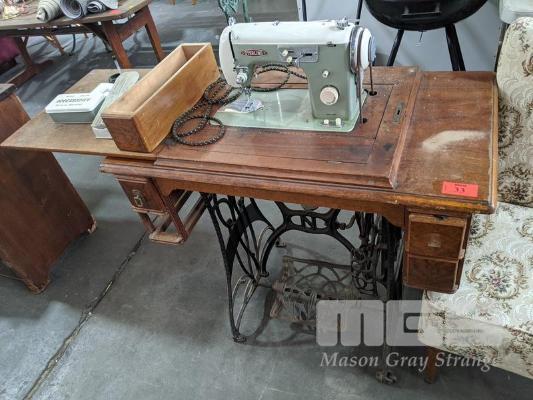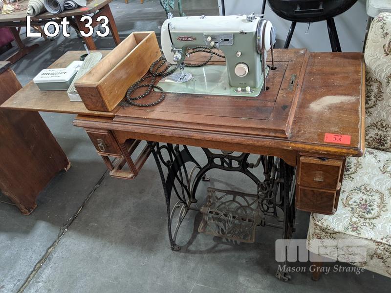 STERLING SEWING MACHINE ON SEWING TABLE, 4 x DRAWER WITH DECORATIVE CAST BASE