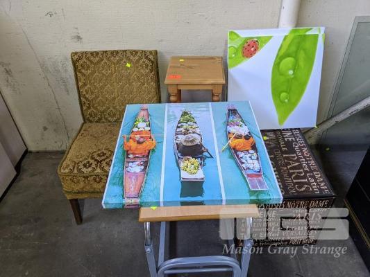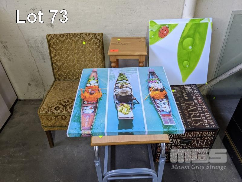 OCCASIONAL CHAIR, 2 x SIDE TABLES, STORAGE CHEST & 3 x CANVAS PRINTS