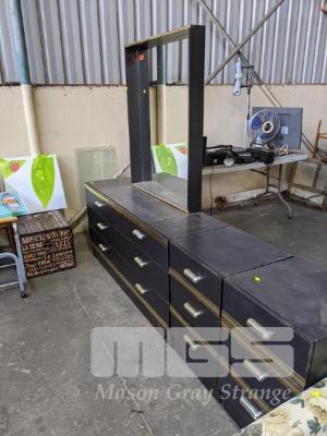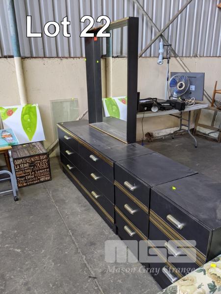 BLACK LAMINATE BEDROOM SUITE,MIRROR BACK DRESSER & 2 x BEDSIDE CABINETS