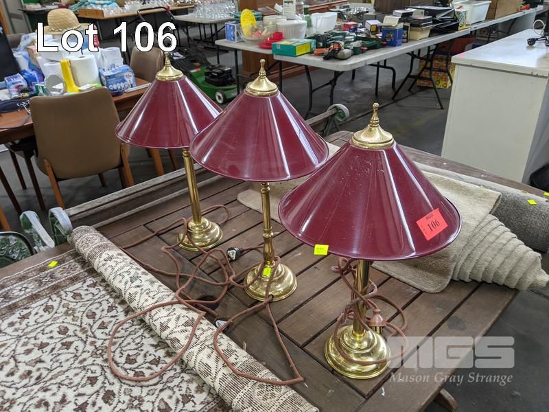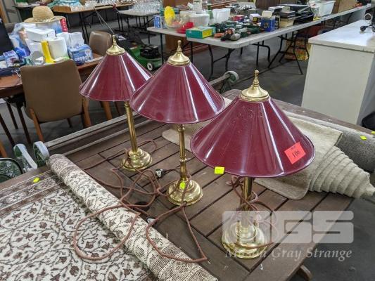 3 x TABLE LAMPS, BRASS BASE WITH BURGUNDY TIN LIGHT SHADES