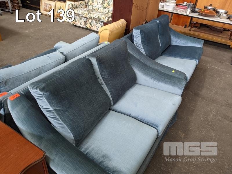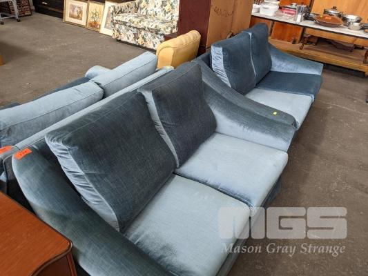 PAIR BLUE VELVET UPHOLSTERED 2 SEATER SOFAS