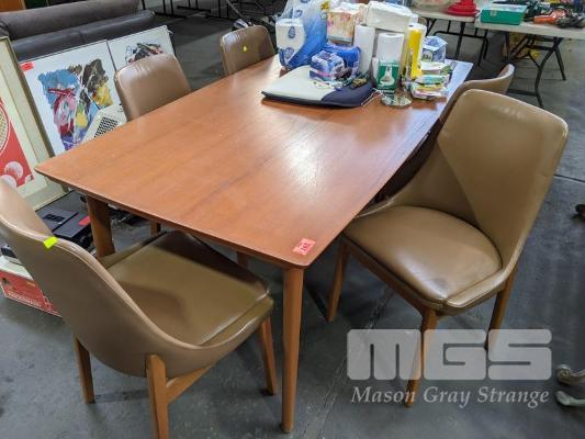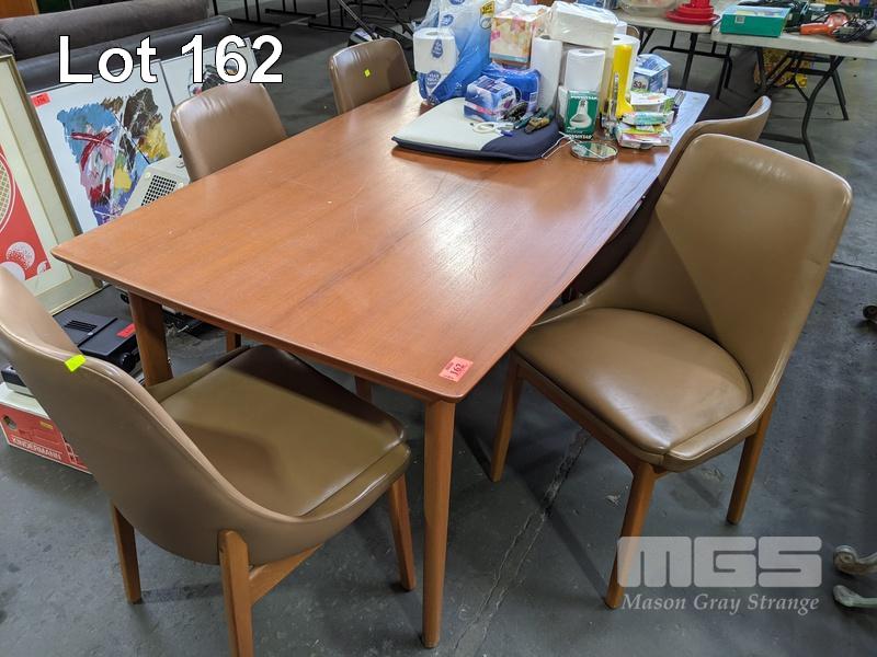 MID CENTURY TEAK DINING SUITE, RECTANGULAR EXTENSION DINING TABLE & 6 x BROWN VINYL UPHOLSTERED CHAIRS