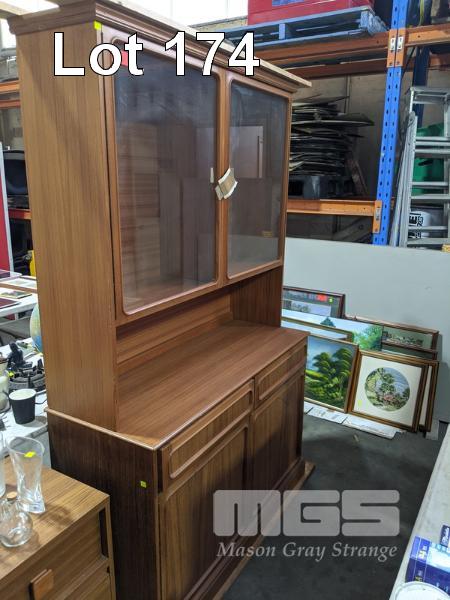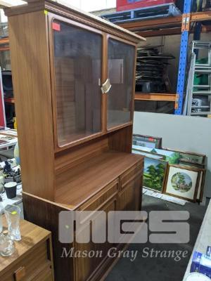 MID CENTURY TEAK WALL UNIT, 2 DOOR GLASS TOP SECTION WITH 2 DOOR/DRAWER UNDERSTORAGE