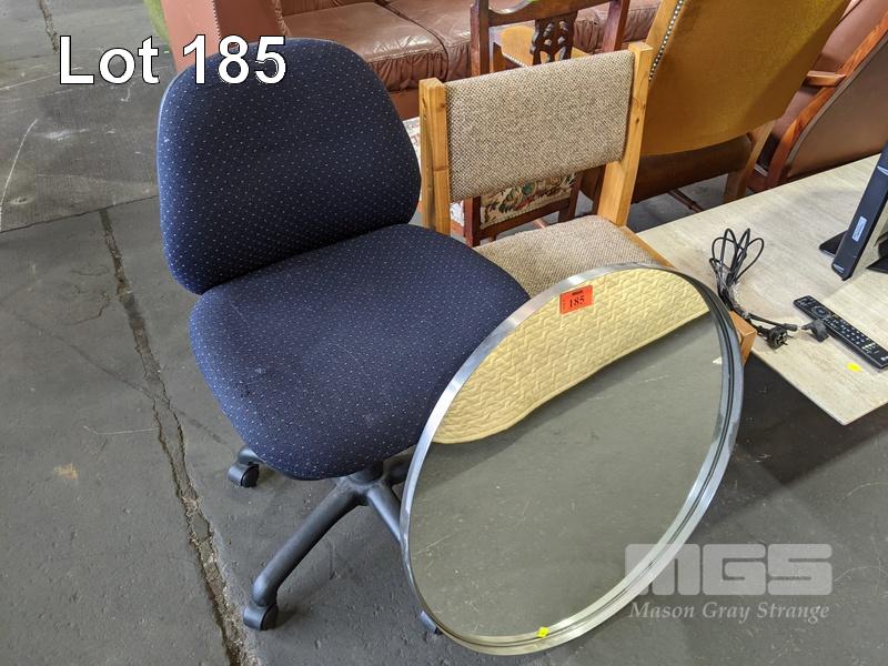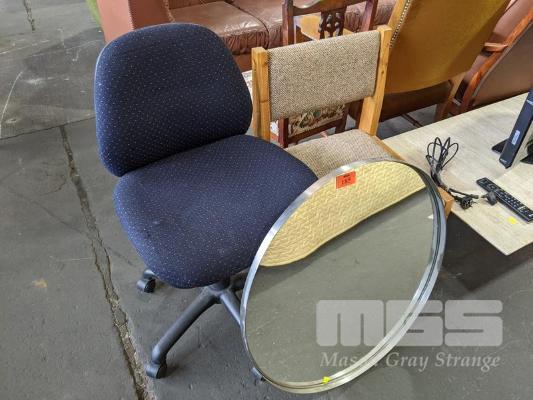 STEEL FRAMED CIRCULAR MIRROR, TIMBER FRAMED & GAS LIFT CHAIRS
