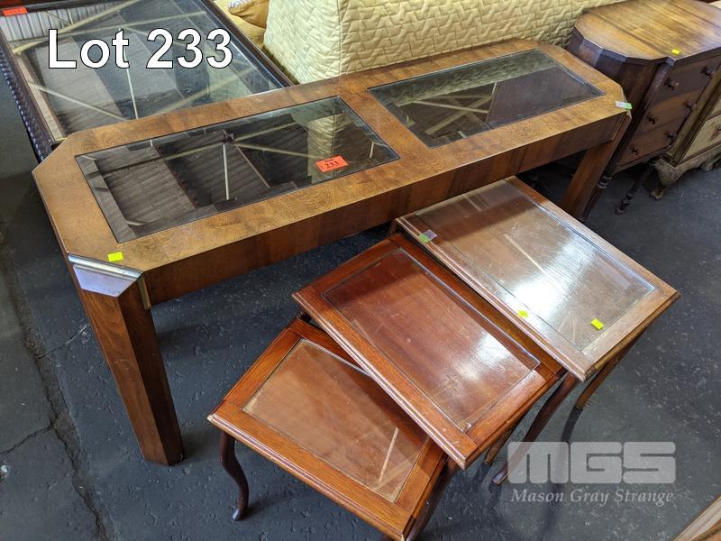 TIMBER HALL TABLE WITH 2 X GLASS INSERTS,NEST OF 3 GLASS TOPPED COFFEE/SIDE TABLES