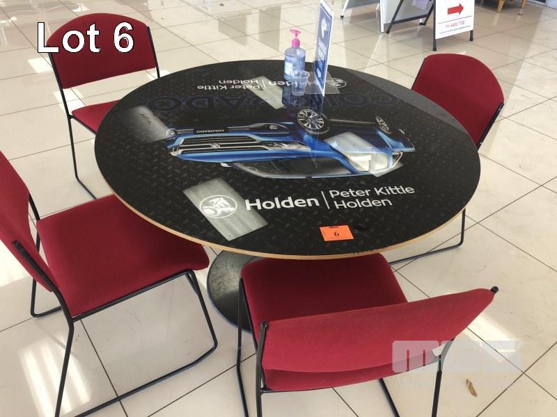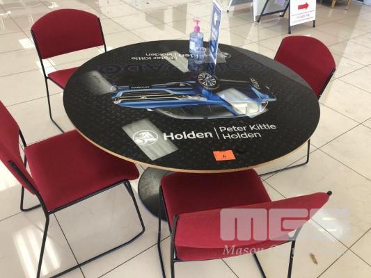 MEETING TABLE, 120cm DIAMETER WITH HOLDEN VEHICLE PRINT, PEDESTAL BASE & 4 x HOLDEN VISITORS CHAIRS, BLACK TUBE, RED FABRIC