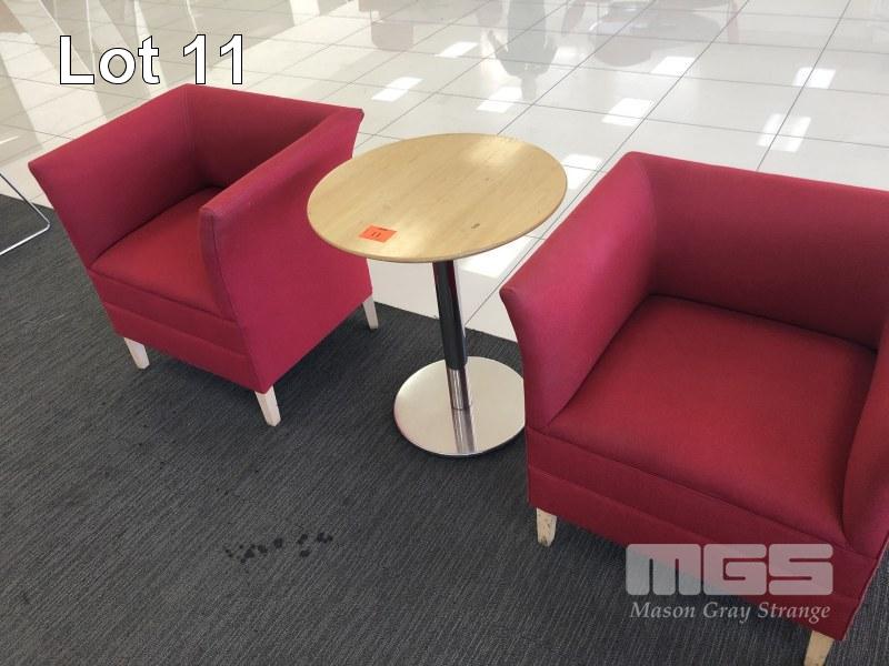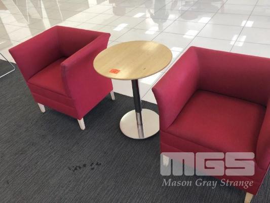 WAITING ROOM SETS, COMPRISING PEDESTAL TABLE, 600mm DIAMETER & 2 x HOLDEN RED FABRIC TUB CHAIRS