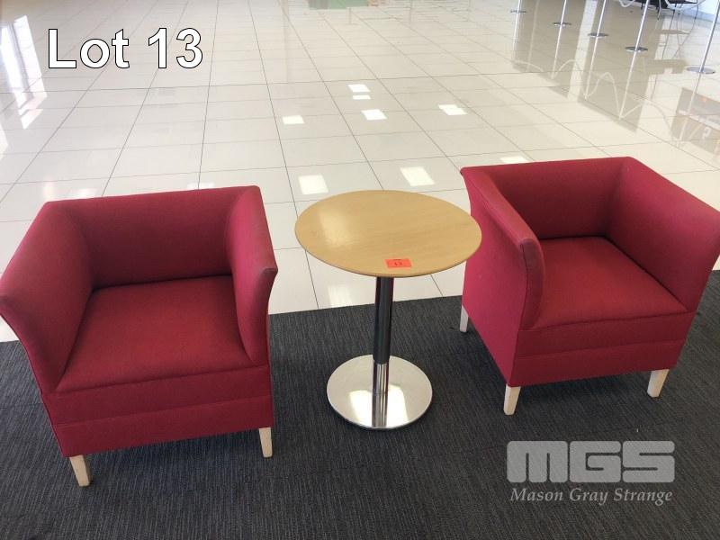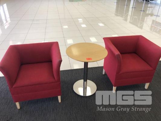 WAITING ROOM SETS, COMPRISING PEDESTAL TABLE, 600mm DIAMETER & 2 x HOLDEN RED FABRIC TUB CHAIRS