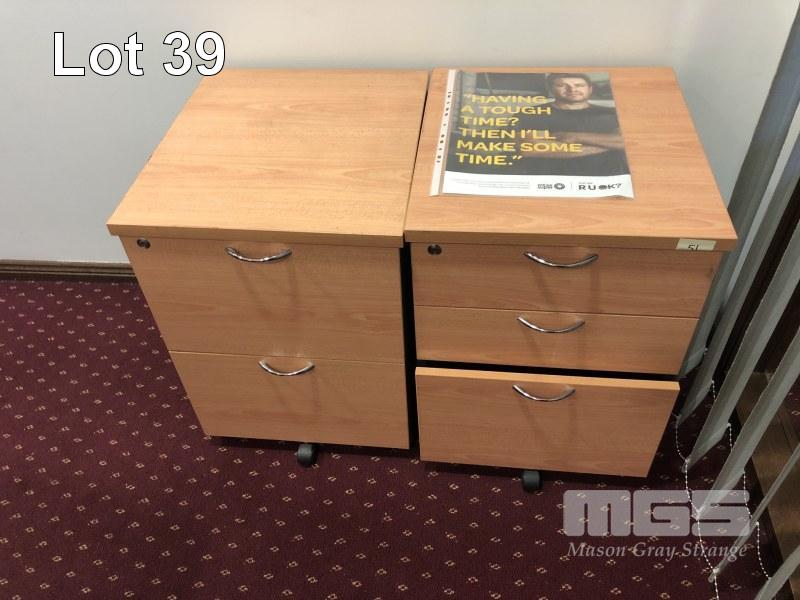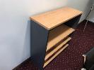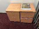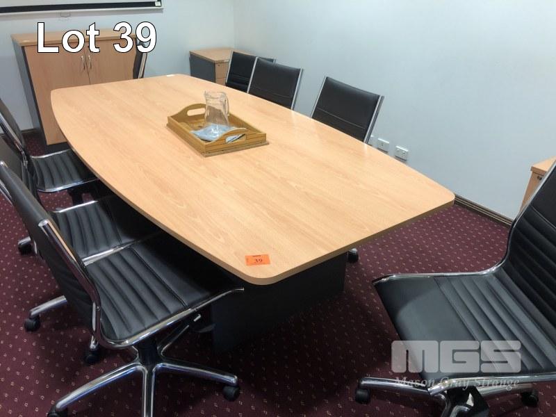 BOARDROOM SETTING INC CURVED SIDED TABLE, 2400 x 1200mm, BEECH/STORM LAMINATE & 8 x COMPOSITE LEATHER GAS LIFT BOARDROOM CHAIRS & LOWLINE MATCHING CABINET & 3 x DESK MOBILES