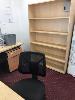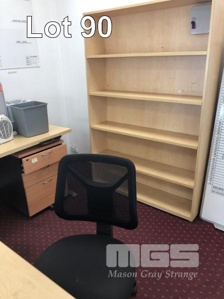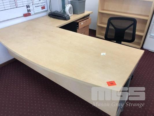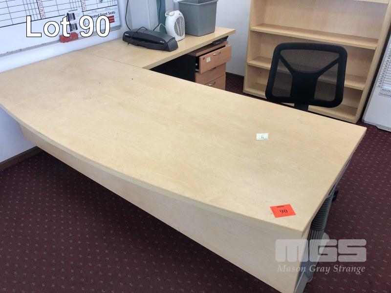 EXEC DESK, SCHIAVELLO, 2100 x 1800mm, RIGHT HAND RETURN, NATURAL PINE LAMINATE & MATCHING BOOKSHELF, 1800 x 1200mm, GAS LIFT CHAIR & MOBILE