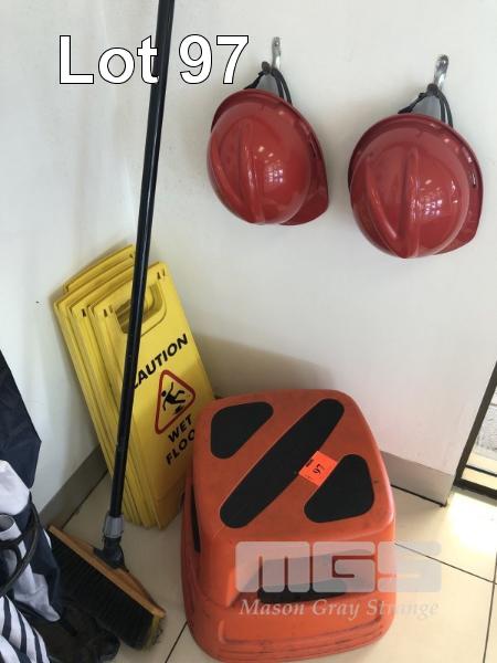SAFE T STEP, WARNING SIGNS, RED WARDEN HELMETS, BROOMS, ETC