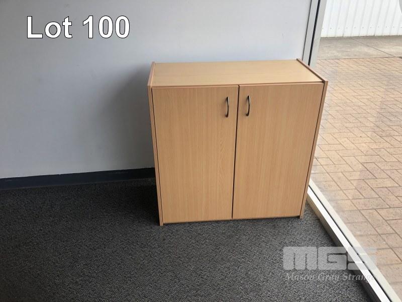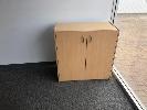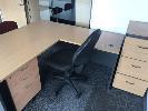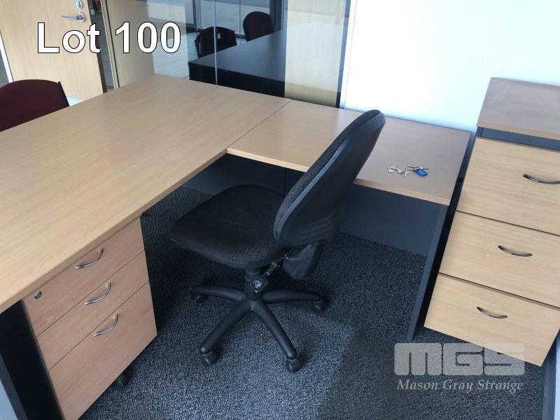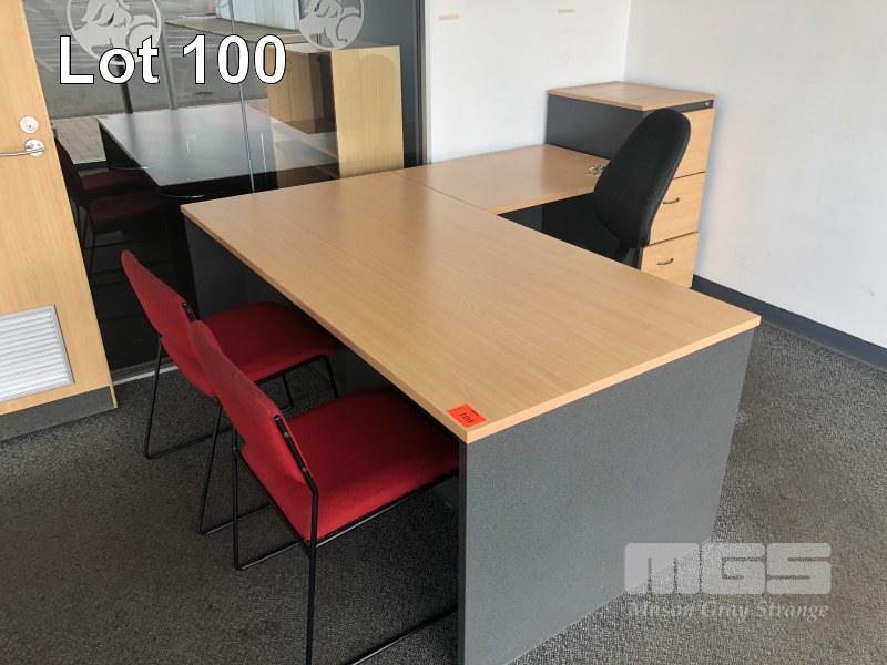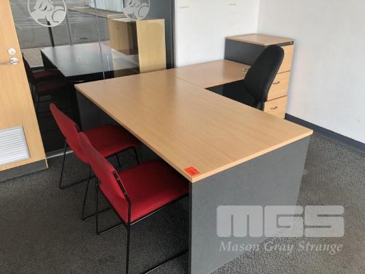DESK WITH RETURN. BEECH STORM TIMBER LAMINATE WITH 3 DRAW UNDER DESK MOBILE. GAS LIFT CLOTH OFFICE CHAIR. 3 DRAW FILING CABINET , 2 DOOR LOW LINE CUPBOARD. AND 2 VISITIR CHAIRS CLOTH / STEEL FRAME. CONTENS OF OFFICE.