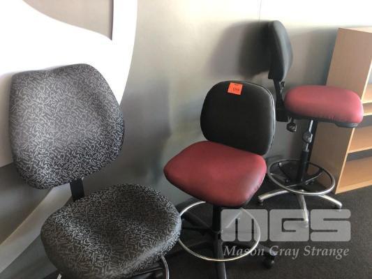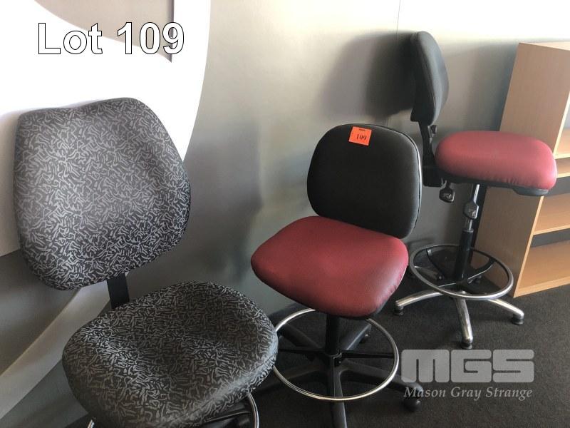 3 x SERVICE COUNTER GAS LIFT STOOL, PLUS PINE TIMBER BOOKCASE, 900 (W) x 1200 (H) x 300 mm (D)