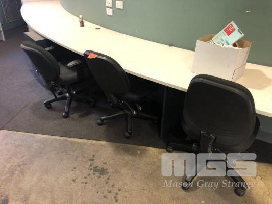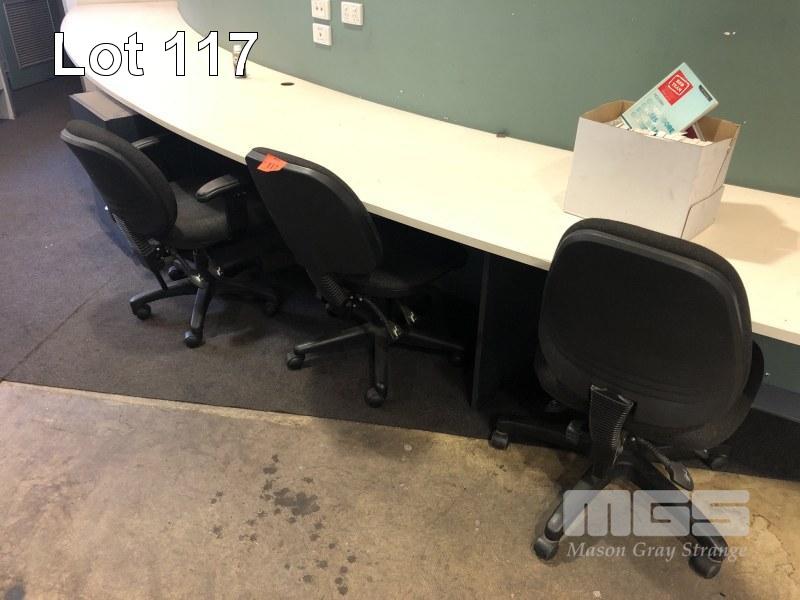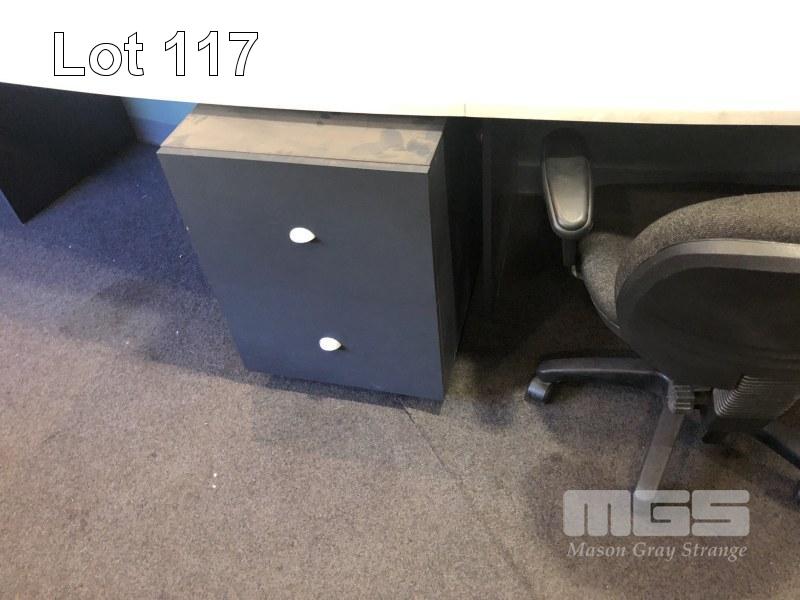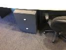 3 x OFFICE CHAIRS, GAS LIFT, BLACK/GREY CLOTH TRIM & 2 DRAWER UNDERDESK MOBILE, GREY TIMBER LAMINATE