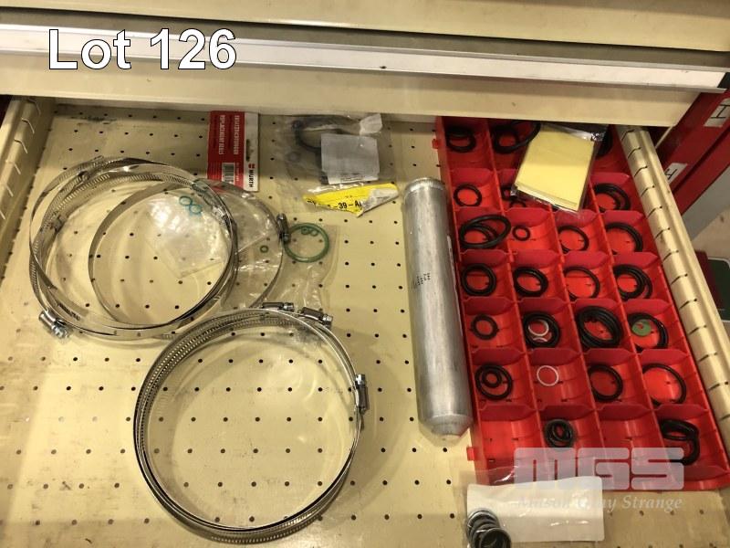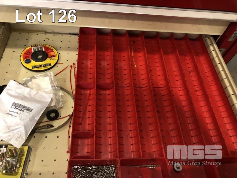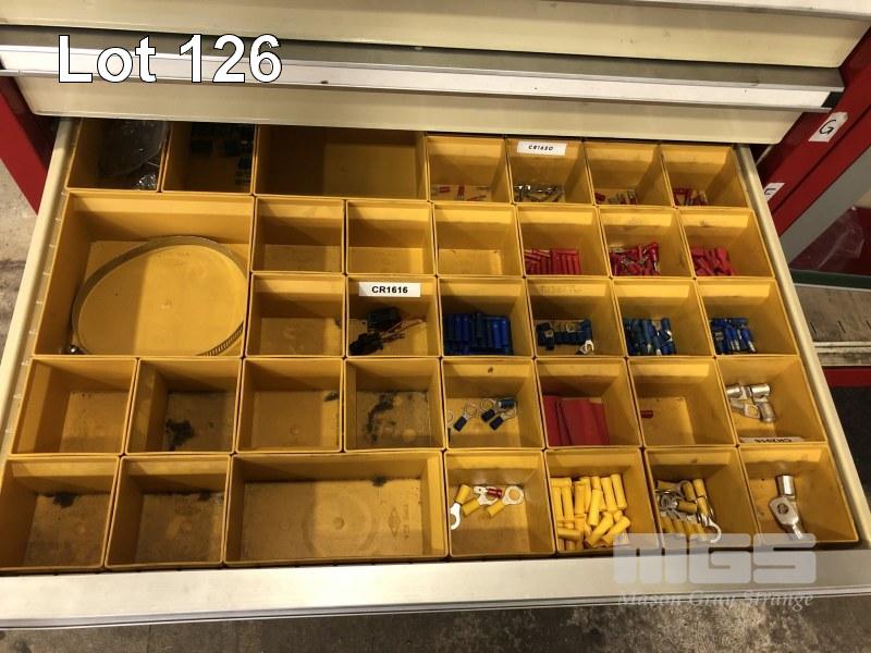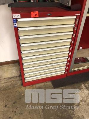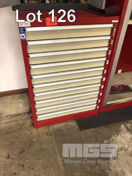 TOOL CABINET, BAC SYSTEMS, 10 DRAWER, RED & CREAM STEEL 700 x 570 x 1000mm (H) & CONTENTS INC ELEC CONNECTORS, HOSE CLAMPS, ETC