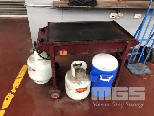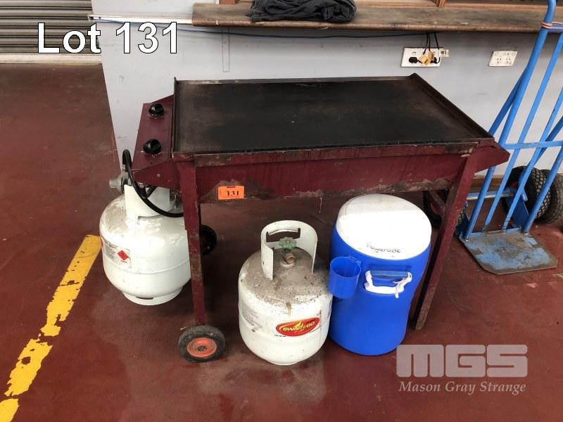 BBQ, 2 BURNER, 860 x 570mm HOT PLATE, 2 x GAS BOTTLES & DRINK COOLER