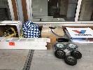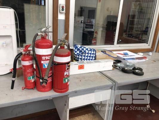 FIRE EXTINGUISHERS, DRY POWDER TYPE, 2 x 4.5kg, 1 x 5kg, TOW ROPE & FITTINGS, 1 x ROLL BLACK VINYL, 80cm & WHEELS TO SUIT TROLLEYS, ETC
