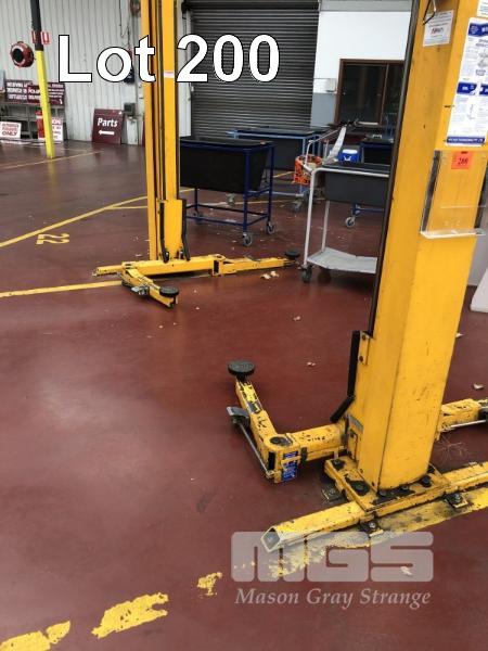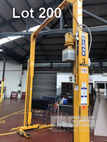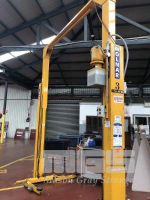 MOLNAR 2 POST HOIST, CLEAR FLOOR HOIST TYPE: MF-1705-93-OH-3T SWL: 3,000kg S/NO: 2240 415V, 3 PHASE (PLEASE NOTE: BUYER TO ARANGE QUALIFIED ELECTRICIAN TO DISCONNECT AND TECHNICIAN TO DISASSEMBLE FOR REMOVAL)